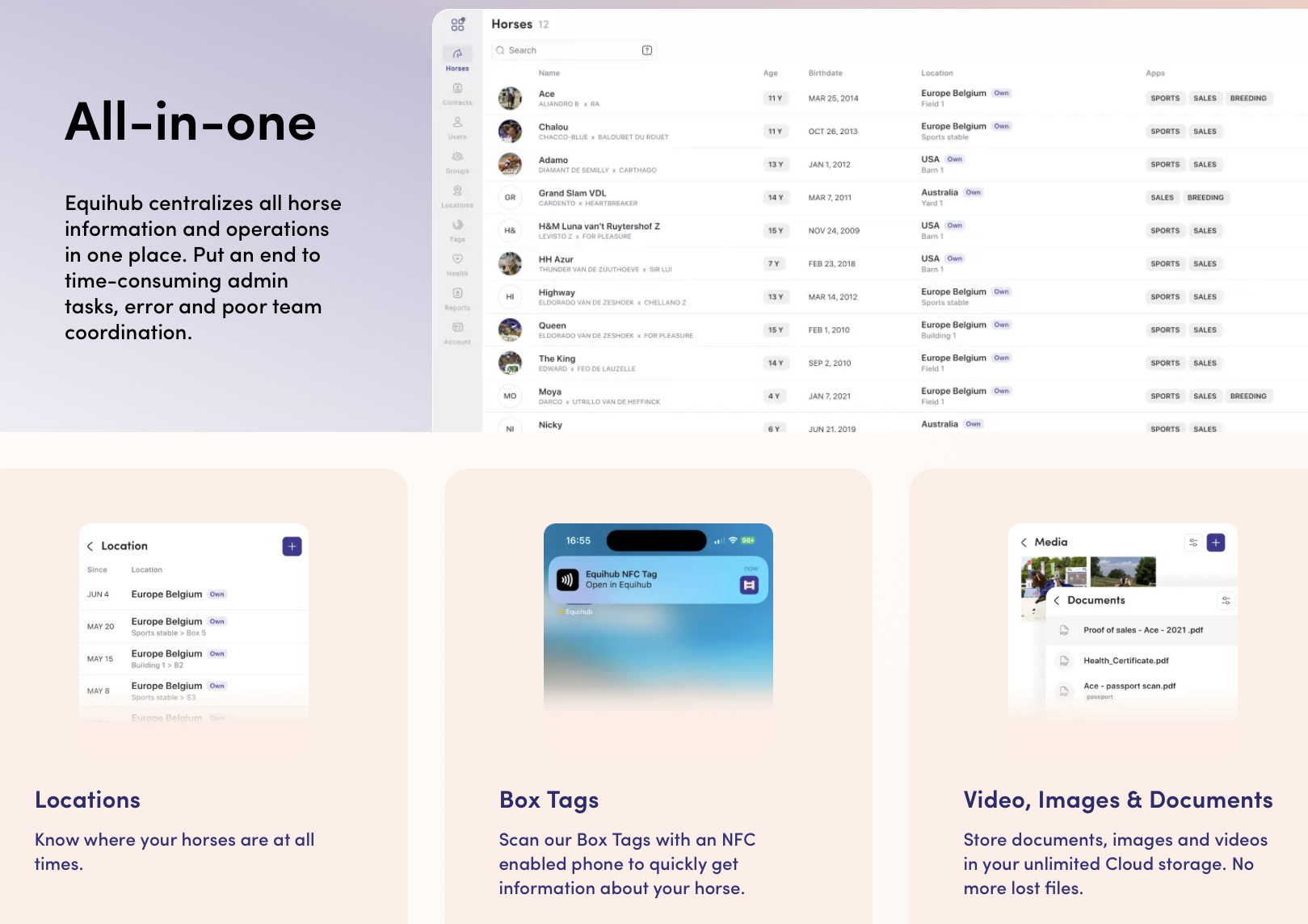 · Box tags & locations — Uses NFC‐enabled box tags and location tracking so that stable staff can instantly access horse info by scanning
