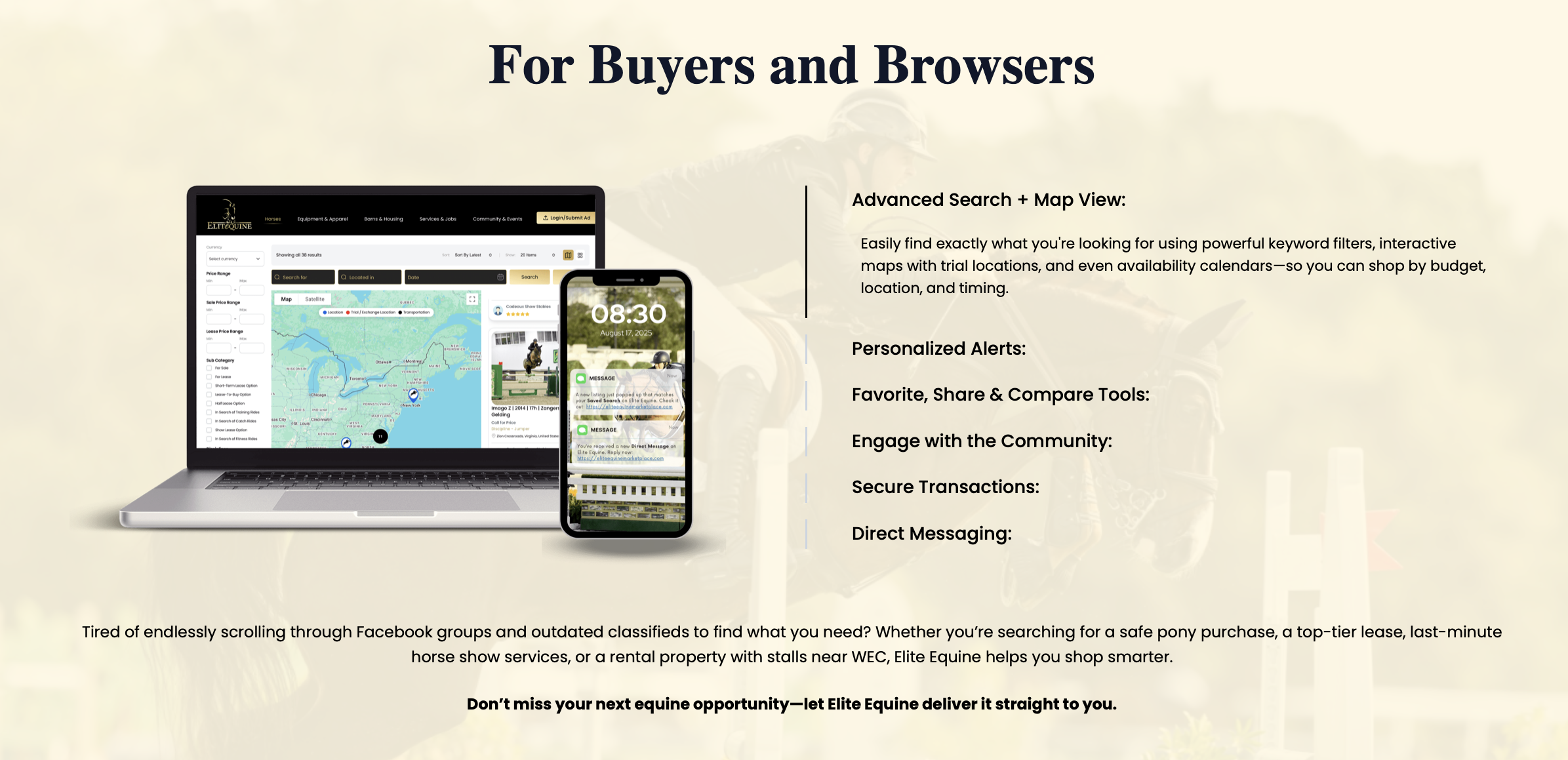 Elite Equine Marketplace boasts advanced features include granular filters, map-based searches, real-time alerts, and performance metrics for listings.