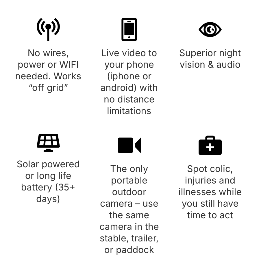 One of the main challenges of monitoring horses is that barns and/or trailers lack access to power and Wi-Fi. Equine Eye cameras are fully wireless and off-grid — no hardwiring, no power, no Wi-Fi required. This makes monitoring easy and stress-free, wherever your horse is.