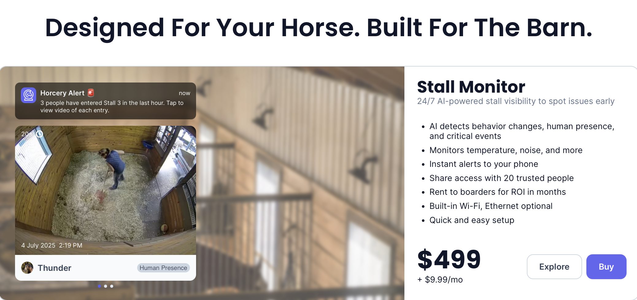 “Our industry leading AI alerts will give you notifications when things happen and deliver clips of each event so you can act fast and catch issues before they become emergencies,” shared Sarah, she added, “The monitor also gives you the joy of checking on your horse and revisiting sweet moments captured on video when you away from the barn.”